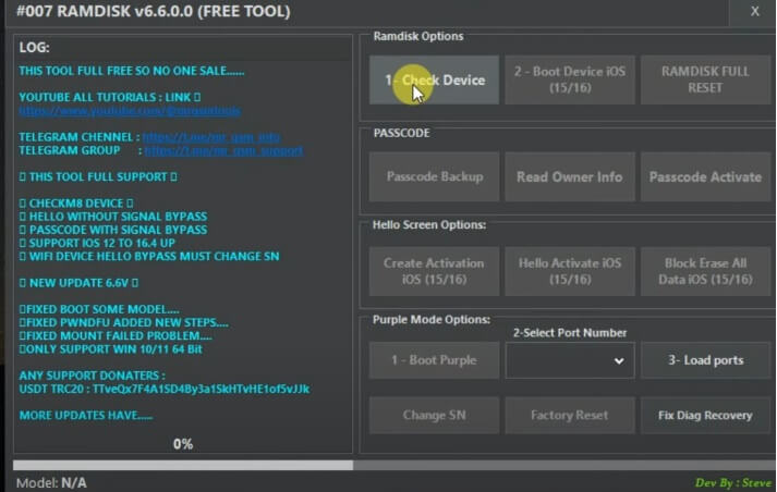 Also, The 007 Ramdisk Tool enables you to bypass Hello Screen without signal, erase Passcode with signal, change serial number, boot purple mode, reset for free and without any registration.
