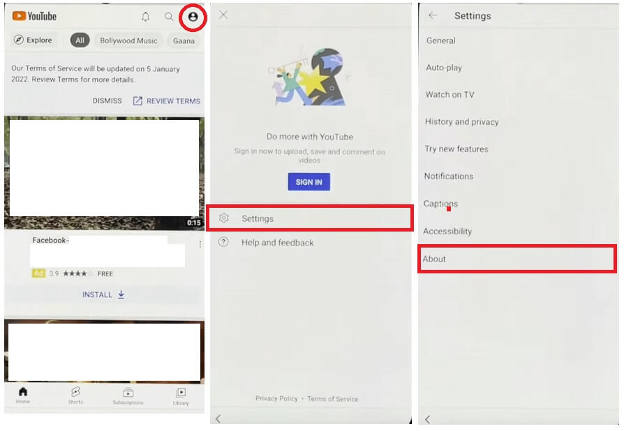 –Tap on Settings > About > YouTube Terms of Service.