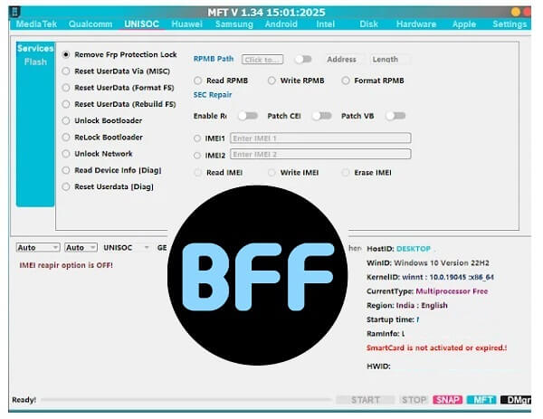 MFT Mobile Fix Tool is a small brand-new Windows utility from Mofadal El Tayeb that supports Qualcomm, SPD, MTK-powered Android smartphones and tablets and offers services FRP Bypass, unlock/relock Bootloader, NVRAM management, Patch MDM, KG, Orange State, & Flash Firmware etc.