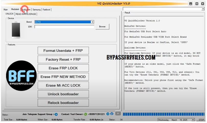 The VG Quick Unlocker enables you to Reset FRP, Format Factory, Safe format, repair IMEI, Flashing firmware, Unlock FRP, and reset screen pattern, password, pin lock on MediaTek MTK, and Qualcomm-based Android phones easily.