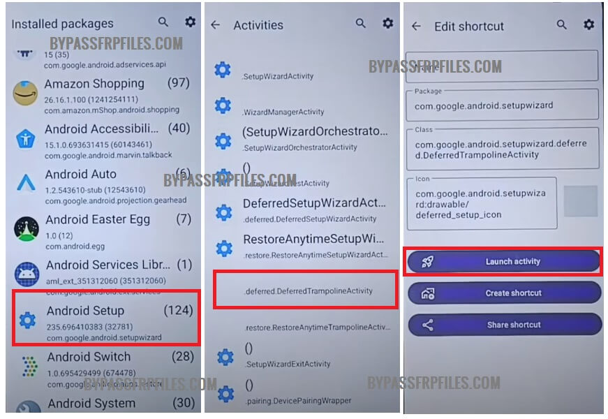 - Select Android Setup > Select “defferedtrampoline.activity”‘ & Tap launch Activity.